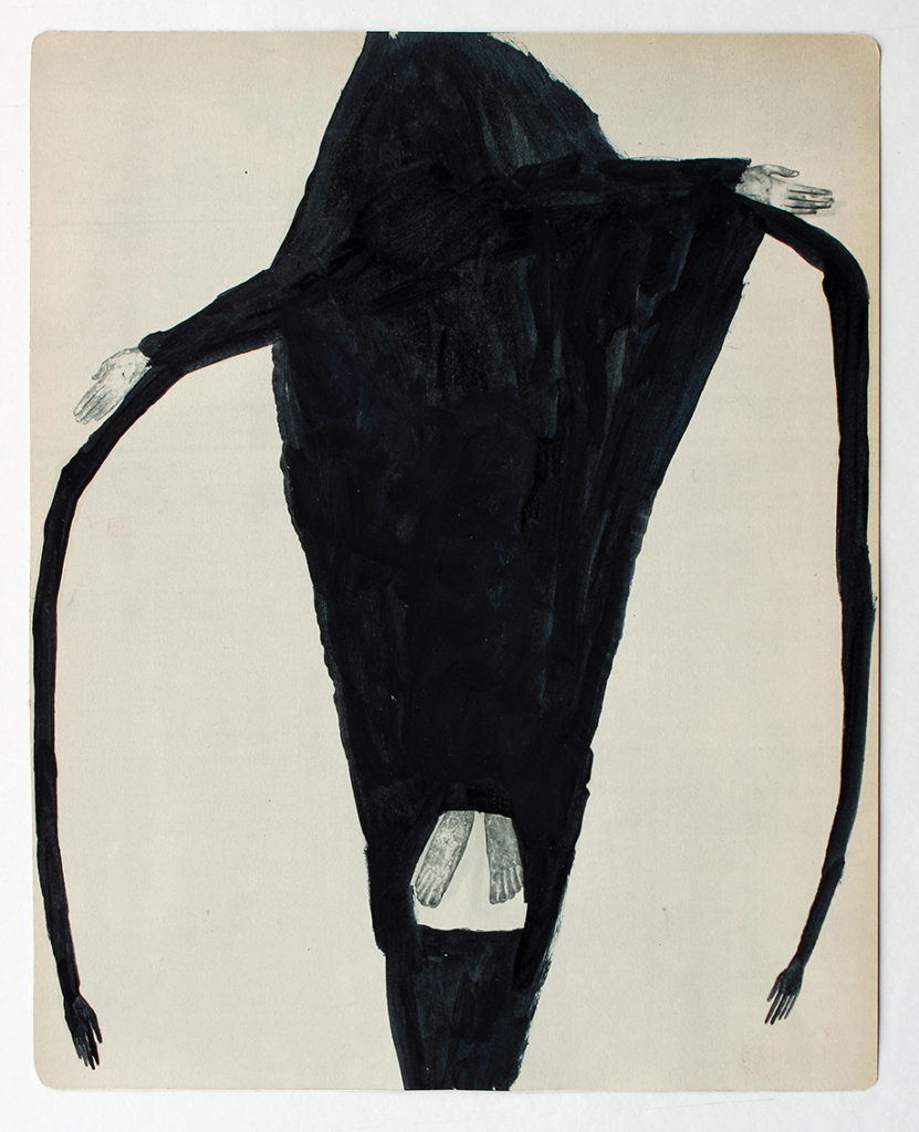 Écho lointain des mains négatives des grottes de la préhistoire, la silhouette peinte joue des interactions de la lumière et de l’ombre, de la présence et de l’absence.