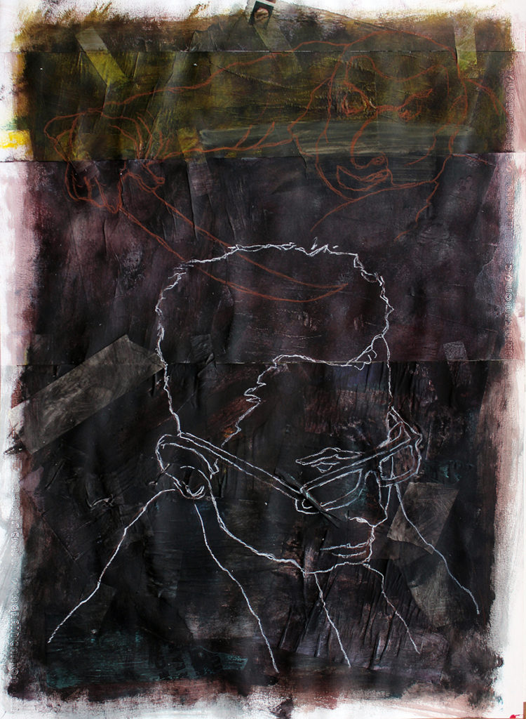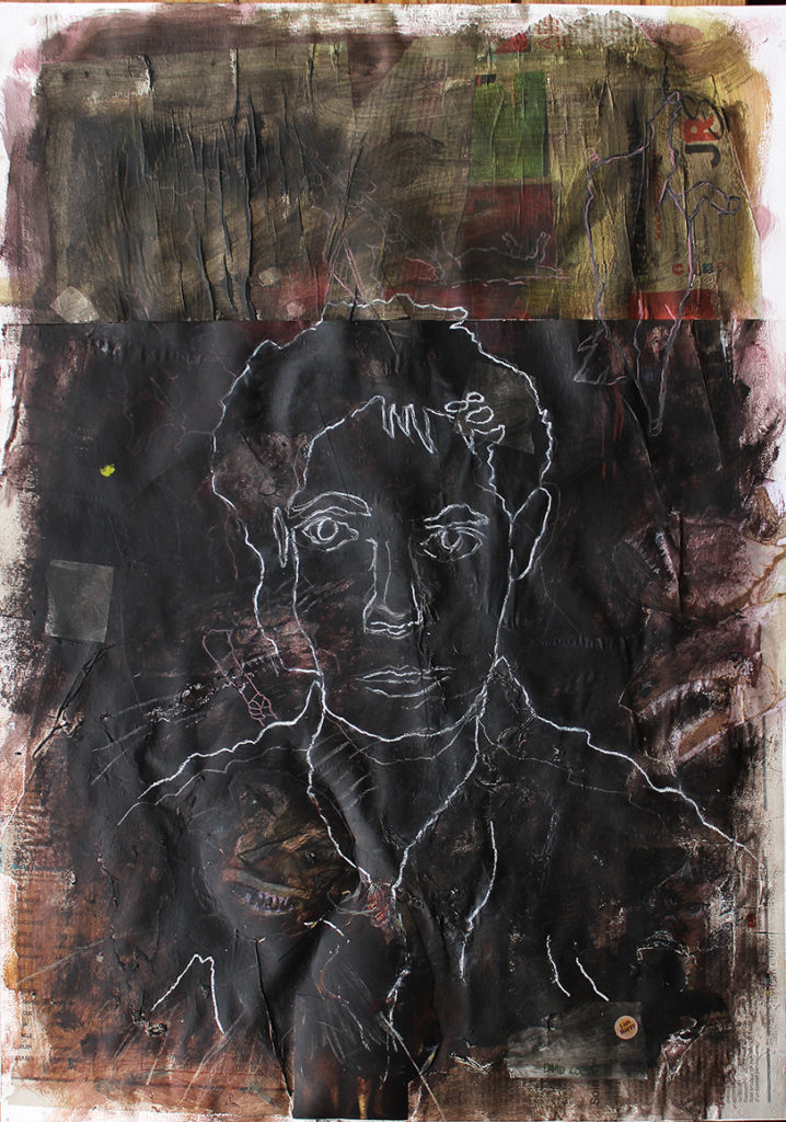 De son travail, essentiellement réalisé à partir de matériaux trouvés au hasard des rues et de photographies personnelles, naissent des tableaux d’apparence abstraite que l’on pourrait qualifier de poésie représentative. Son imaginaire d’enfant se pose sur des petits bouts de vie qui finissent par s’assembler. Au devant de ses toiles : personnages étranges, objets indéfinis, malaises, joies ou souvenirs vécus ou espérés. Cherchant l’erreur, voire l’accident, la finalisation de ses projets se fait presque les yeux mi-clos. Cette série est un ensemble incohérent de ses souvenirs fantasmés et des traumas de son enfance. Sans la douleur, quels repères ? Aude Bartoszewski